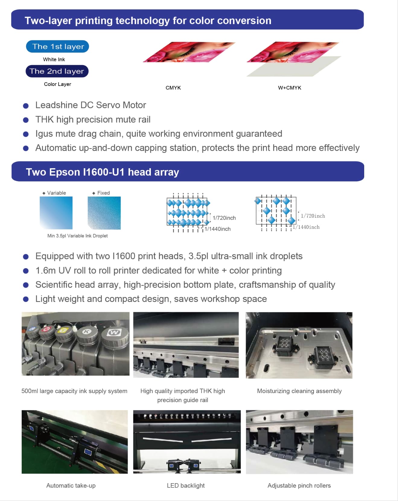 | 1.6m Four color,white+color UV roll to roll printer with I1600-U1 print heads. |